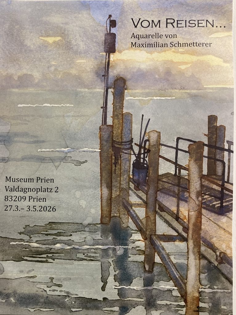 Maximilian Schmetterer, ein gebürtiger Priener, war bis 2006 als Augenoptiker tätig und zählt zu den Poeten der Chiemgauer Künstler. Der Rosenheimer Maler und Bildhauer Rolf Märkl führte ihn früh in das bildnerische Gestalten ein, ehe sich Schmetterer ab 1995 intensiv mit der Aquarell-Malerei auseinandersetzte und bei bedeutenden Aquarellisten Unterricht nahm. Maximilian Schmetterer gehört mit seinem eigenen, feinen Malstil zum Kernbestand der Künstlerlandschaft Chiemsee. „Mit einem neuen Blick auf Wohlbekanntes offenbart er hinter dem Schein des Hässlichen das Sein des Schönen“, wie es die Kulturvermittlerin Renate M. Mayer umschrieb. Seine Reisebilder zeigen keine im Sonnenlicht strahlenden Postkartenmotive, sondern legen mit ihren oberflächlich unspektakulären Sujets eine gewisse Melancholie an den Tag. Die Ausstellung würdigt das Werk des Künstlers zu seinem 85. Geburtstag. [Karl J. Aß Kulturbeauftragter Markt Prien.]